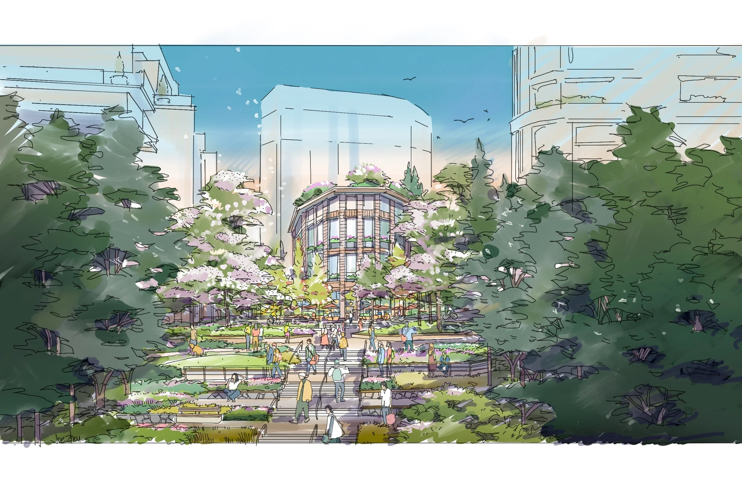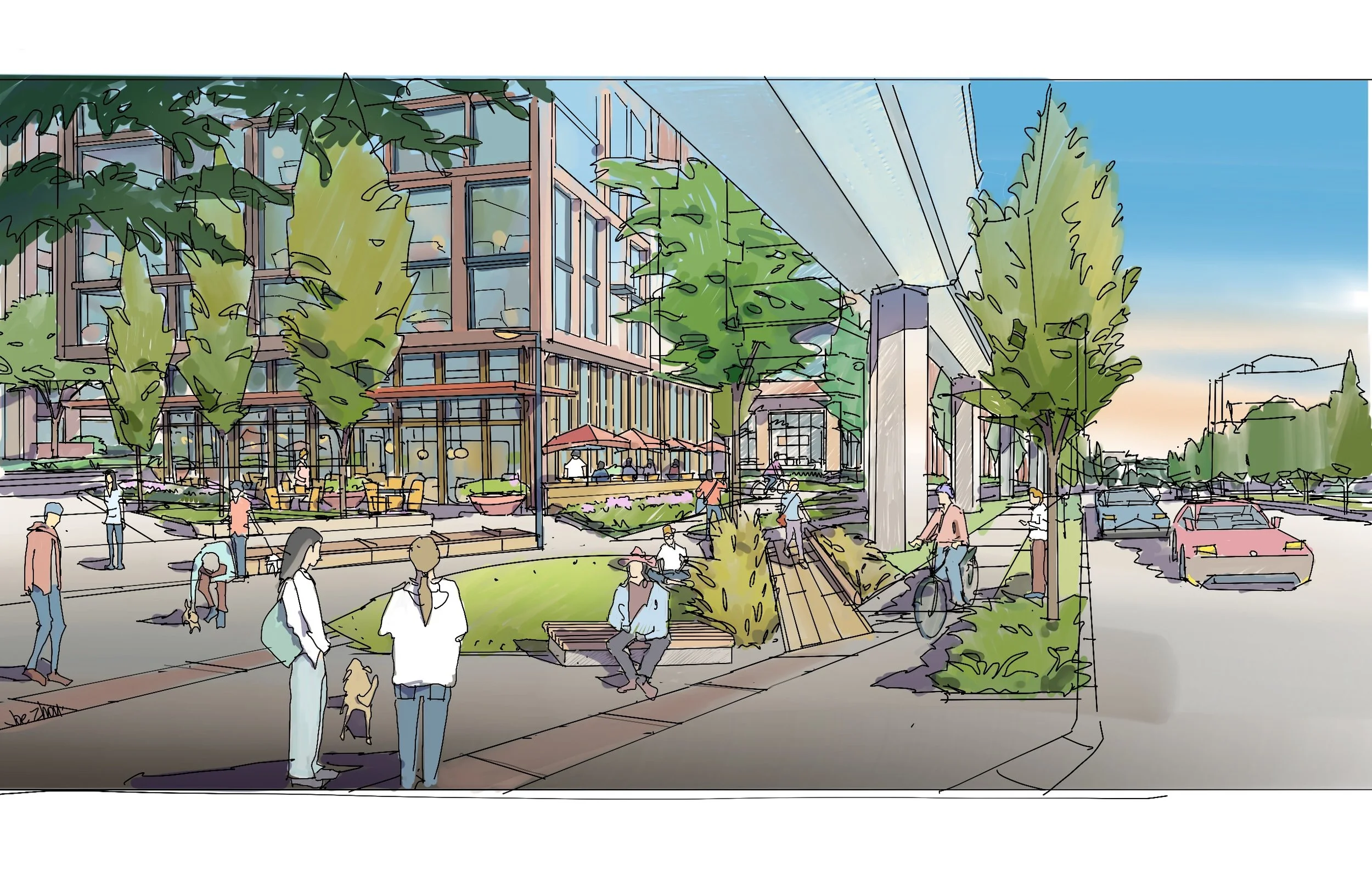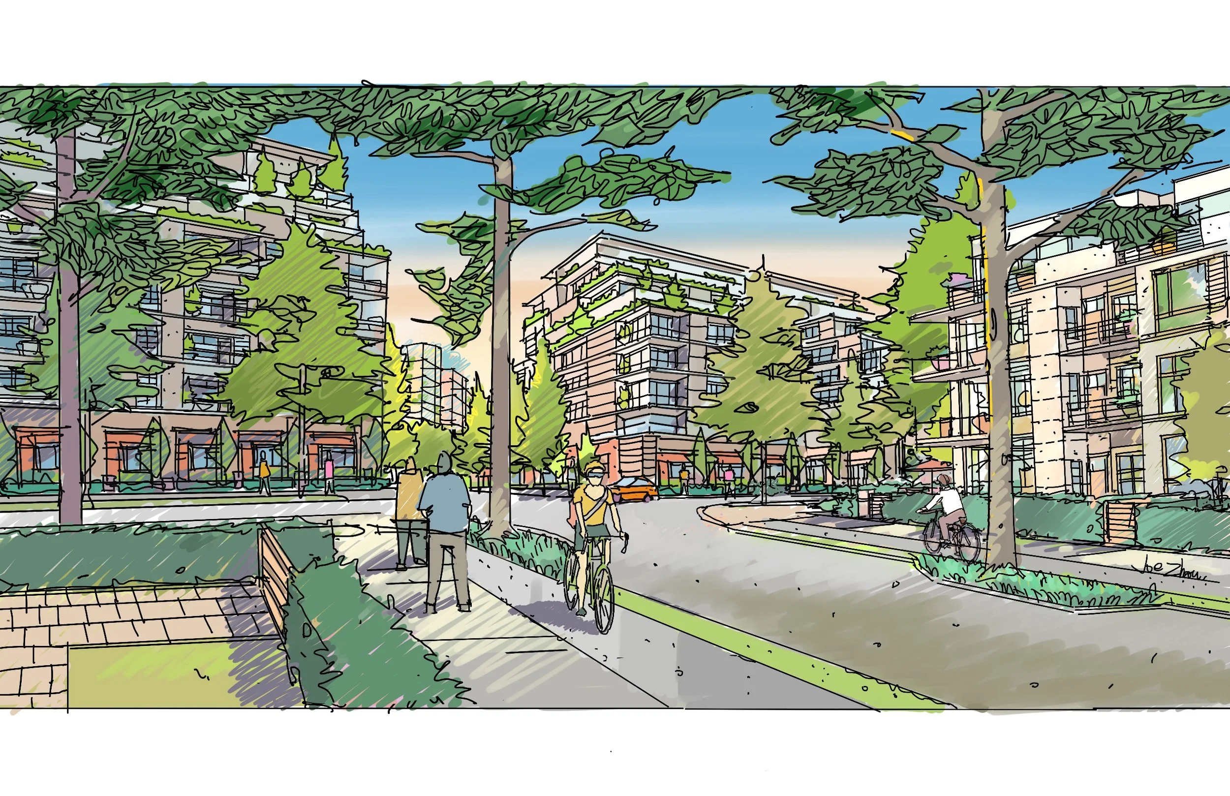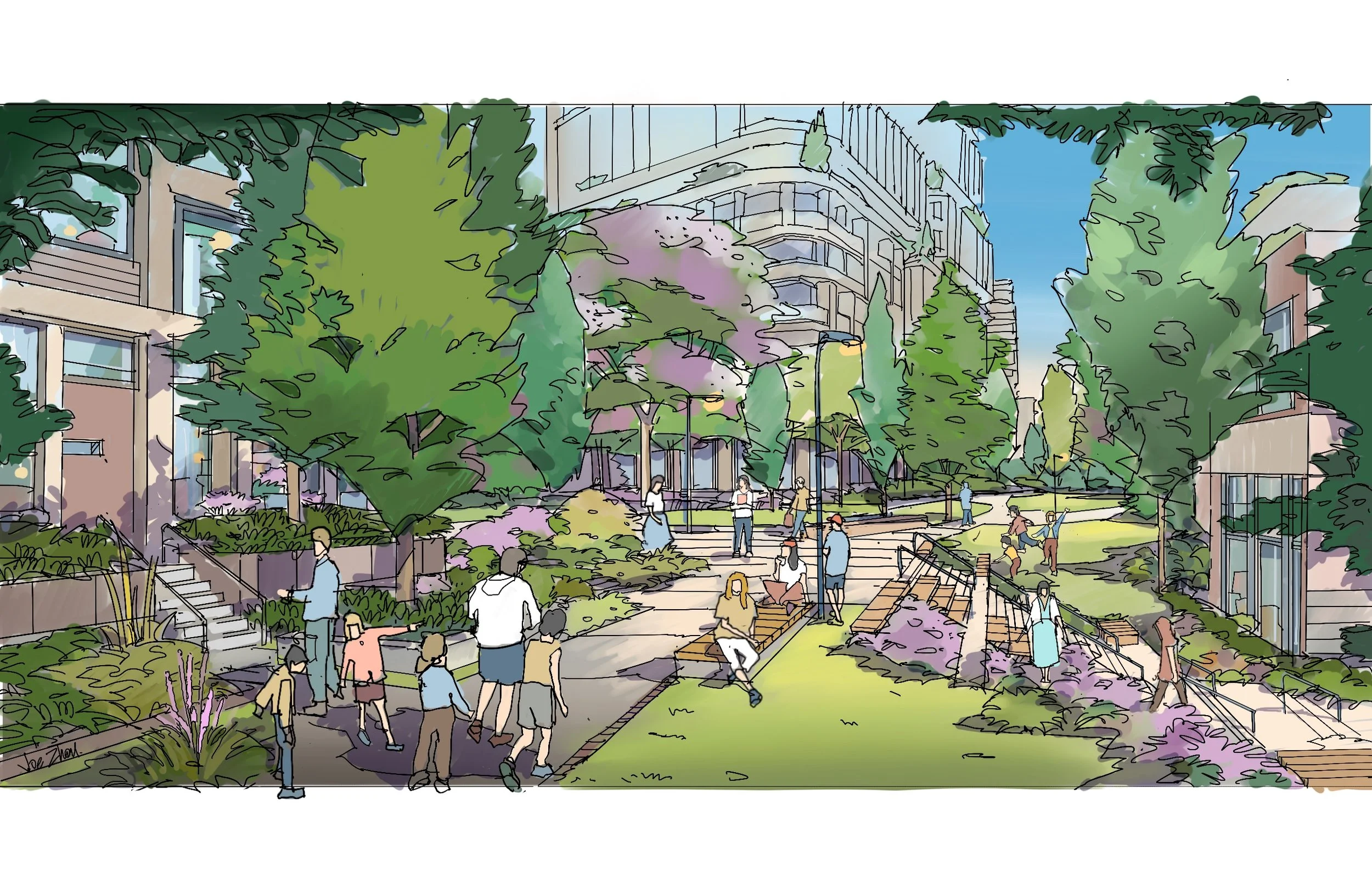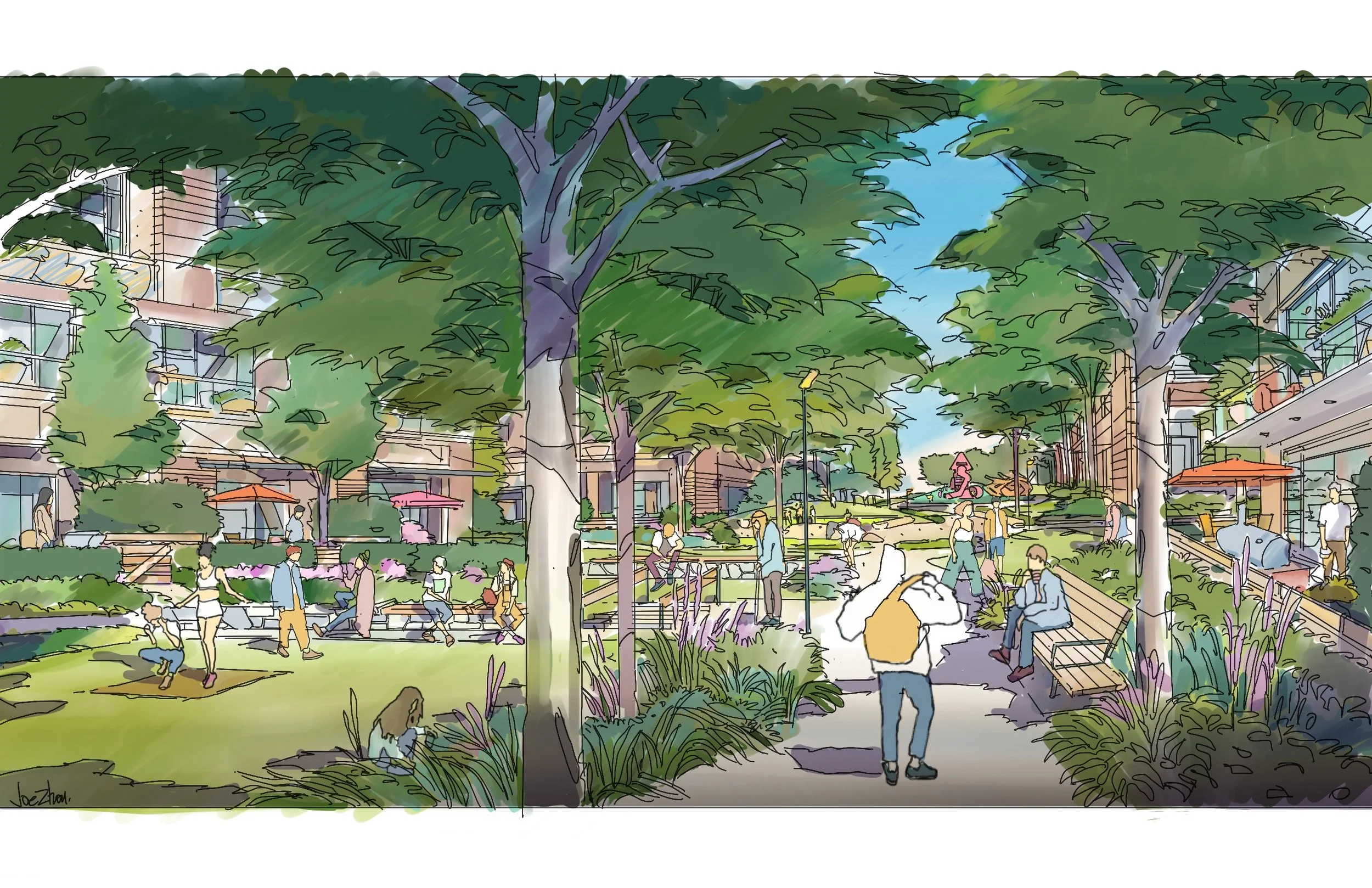 The landscape vision emphasizes ecological integration and climate resilience by daylighting portions of the local creek, restoring native habitat, and introducing green stormwater infrastructure throughout the site. Thoughtful transitions to surrounding neighbourhoods are achieved with layered planting, tree buffers, and human-scaled design elements. Public open spaces are designed as inclusive and multi-functional—supporting cycling, gathering, play, and daily recreation—while strengthening connections to Burnaby Lake Park and the Central Valley Greenway. It is an opportunity to create a complete and resilient urban village, where public space and ecological systems are deeply interwoven into the fabric of everyday life.