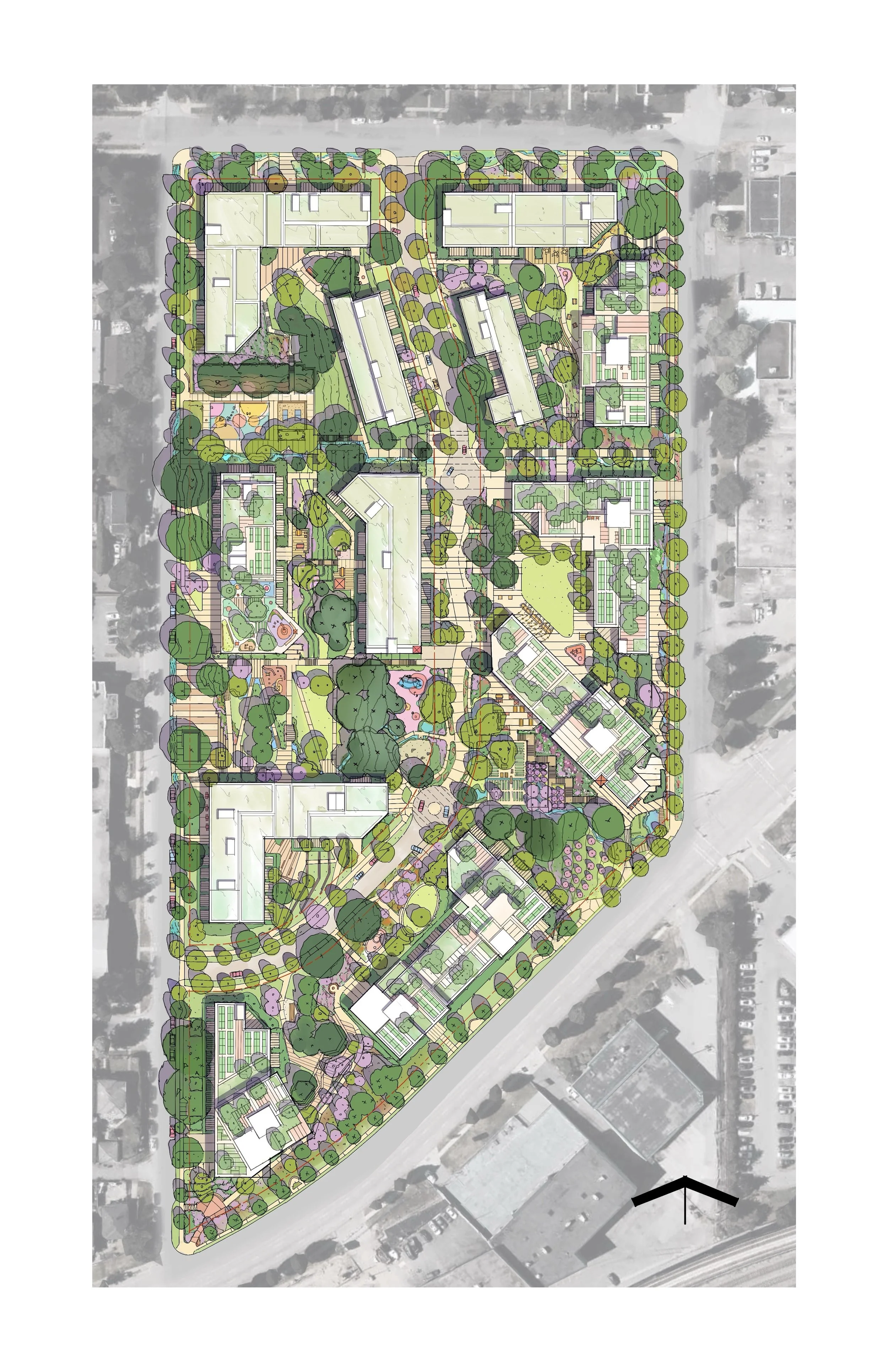 Skeena Terrace is home to a diverse community on 4.4 hectares in Vancouver, and includes a terracing landscape designed by Cornelia Hahn Oberlander, but its 1960s-era buildings require extensive repairs. The plan preserves the site’s mature urban forest while introducing a network of greenways and accessible paths that connect new housing and communal outdoor “neighbourhood rooms.” These landscaped courtyards and plazas support social connection, active mobility, and ecological resilience. Anchored by the recreated Skeena Hut and enhanced community facilities, the landscape design reinforces a sense of place, continuity, and inclusion —creating a welcoming, equitable environment for a diverse and growing community.